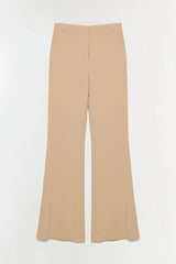 The Kenna Trouser in Light Camel A flared leg trouser cut in clean lines with a slim waistband, front side slit pockets, and back welt pockets.