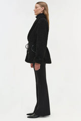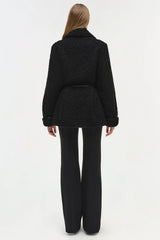 The Kimia Tie Waist Jacket in Black Faux sherpa wraps into a plush jacket with a fold over collar and a self‑tie belt. The body is relaxed yet held by the sash, ending at hip length and trimmed in vegan leather.. Warmth and texture, shaped with intention.