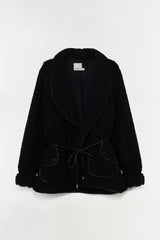 The Kimia Tie Waist Jacket in Black A fax sherpa jacket with a foldover collar, tie front closure, and front pockets.
