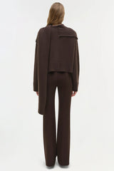 Simkai's Elson Wool Cashmere Scarf Sweater in Chocolate. A cropped wool cashmere blend sweater with long sleeves, wide banded hems, and a wraparound scarf detail at the neck.